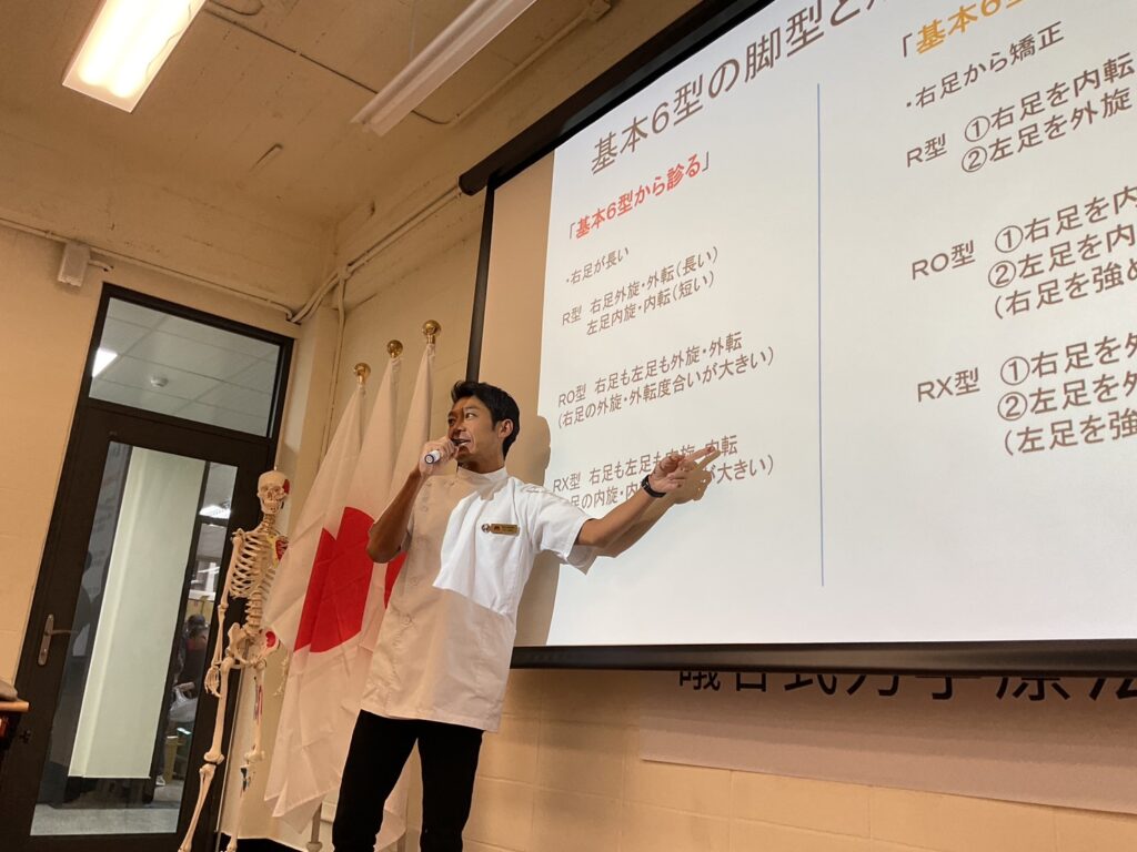 講義の内容は、前回に引き続き「健康指導員育成コース」を中心に展開しました。今回は特に、礒谷療法の根幹ともいえるLX型(左股骨転位)とRX型(右股骨転位)の判別と矯正法を重点的に伝授。
